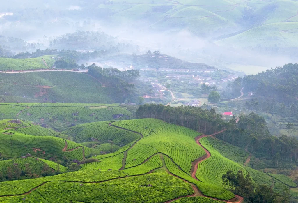 Majestic ancient Dravidian temples rise above the expansive rice paddy plains, showcasing intricate architecture and rich history; houseboats drift silently through mirror-calm backwaters, offering a glimpse of a serene lifestyle that seems untouched by time; the enticing aroma of cardamom and other spices drifts down from the misty, verdant hill stations, stimulating the senses and inviting exploration.